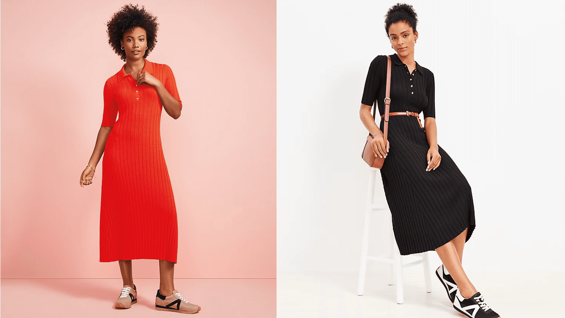 Petite peeps, this dress comes in a shorter version so you can buy without having to tailor it. We prefer this ribbed fabric because it’s thin enough to take you into spring and summer, but is also thick enough to be layered underneath a flannel or sweater during the cooler months. Not to mention, you can’t go wrong with a classic polo style. ($99.95, Loft)