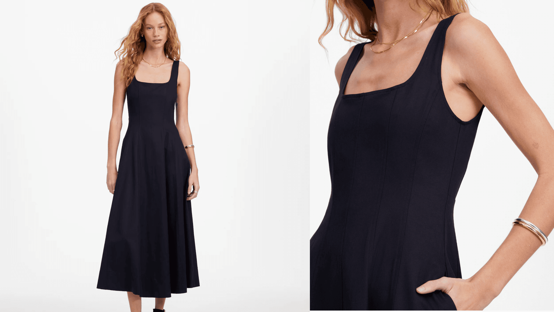 You might have to do some extra digging, but you can always find a good wedding guest dress at Madewell. This square neck midi dress comes in both black and khaki, but I’d suggest grabbing the black and using accessories to dress it up. It has a fitted bodice and a skirt with lots of volume, so it’ll easily pass for a nice-enough dress for your upcoming event. The best part: You aren’t spending a ton on a wedding guest dress you’ll never wear again. ($158, Madewell)