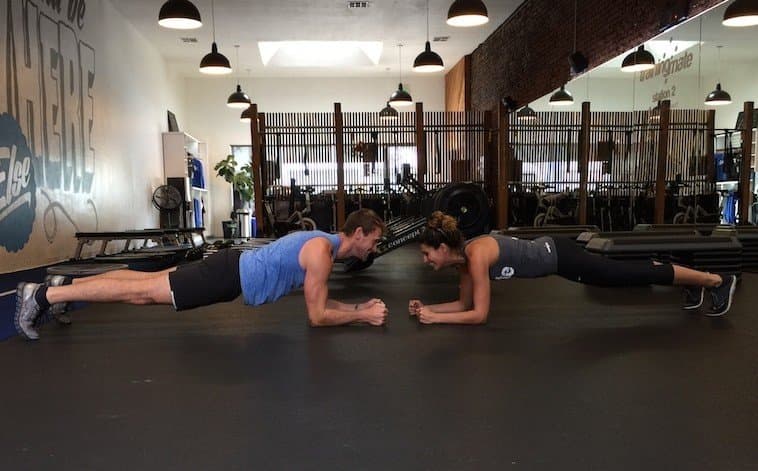Come into a forearm plank position and hold for 45 seconds while looking at your partner (this helps to keep your spine neutral).