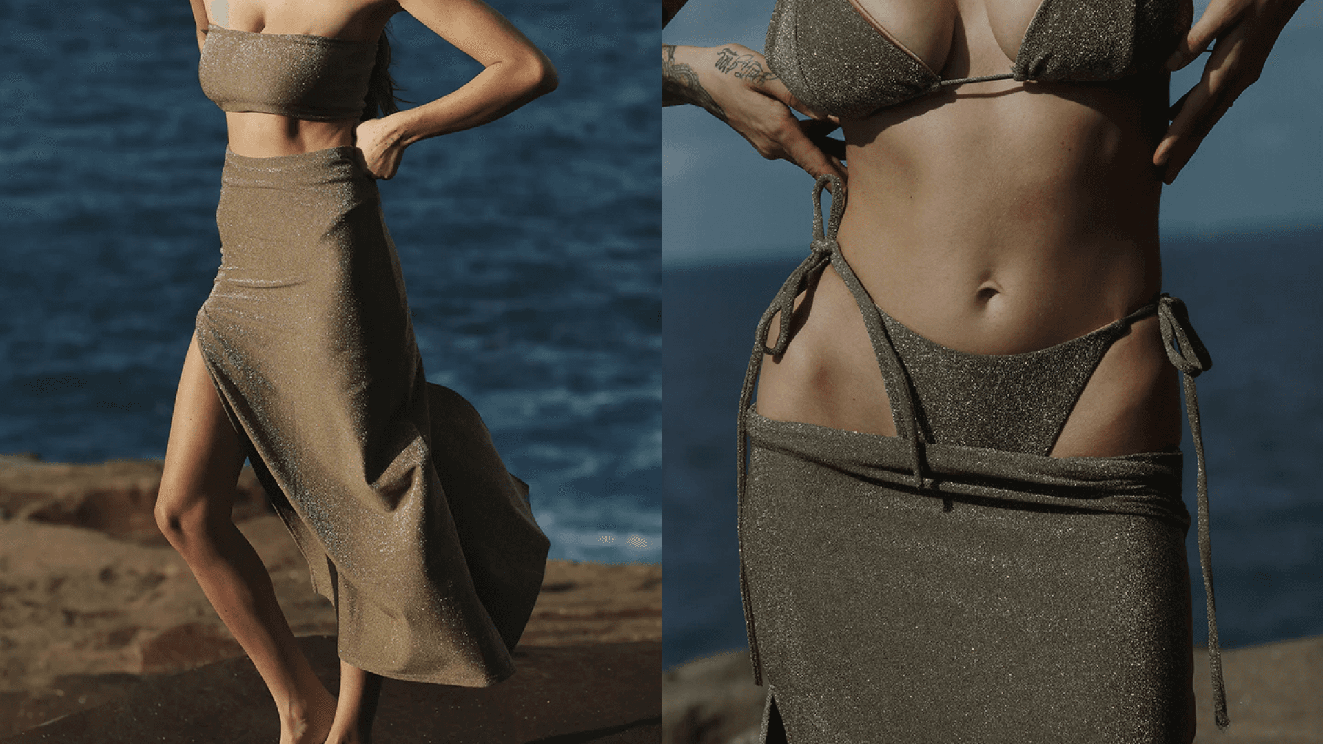 While most swim skirts are mini in length, maxi swim skirts exist, too (and they’re thriving!). We especially love the SIE Isabel Maxi Skirt, which shimmers and stretches for an eye-catching end look. It pairs beautifully with the coordinating SIE Taylor Bikini Top, Stella Bikini Top, and Dani Bikini Top. While it’s meant to be worn over a bottom, thanks to its length, you likely wouldn’t flash anyone if you went without. Made with a nylon-spandex material, it’s water-safe, but not meant to be fully submerged (although you technically can). Size up for a more relaxed fit.