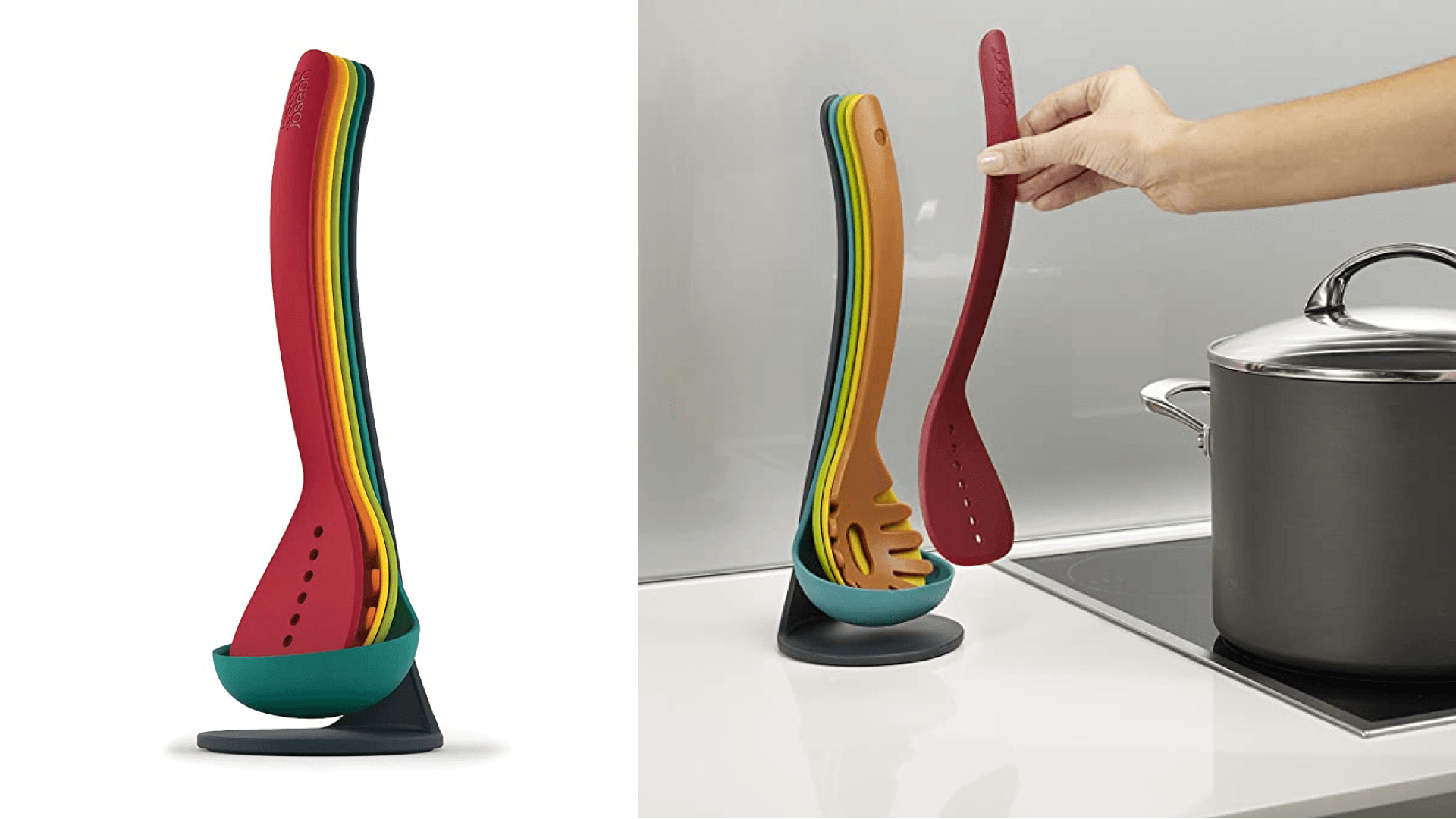 The worst feeling = opening your utensil drawer and getting it stuck due to clutter. This magnetic set of five fits together compactly and can sit right on your countertop. You’ll get a slotted spatula, a spaghetti server, a slotted spoon, a solid spoon, and a ladle. They’re heat resistant up to 200 degrees, dishwasher safe, and of course, save you a ton of space. So satisfying. ($32.18, Amazon)