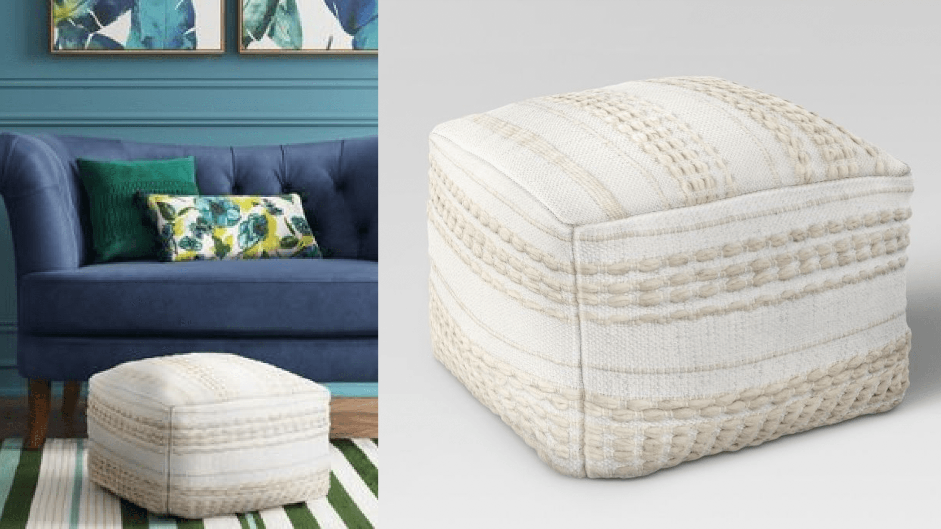 If you don’t have enough room for a bigger ottoman, a pouf is a great substitute. You’ll have a place to rest your feet and extra seating for guests. This one is made from a blend of cotton and wool for durability and softness. It’s also available in various textures and colors, from pink and orange to black and white. ($65, Target)