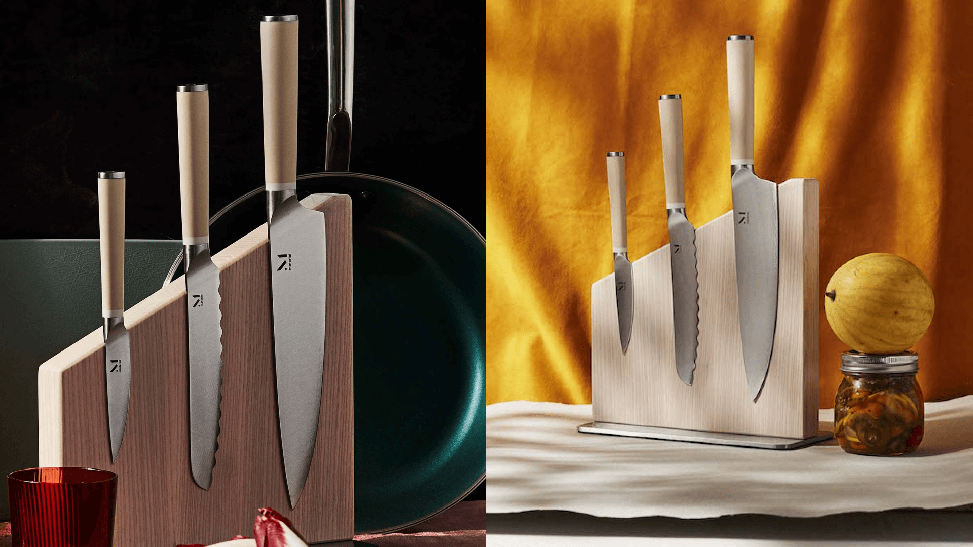 This versatile set includes an 8-inch knife, a serrated 6-inch knife, and an almost 4-inch knife, plus a streamlined magnetic stand. They’re made of Japanese high-carbon and stainless steel, and even after a year, they stay sharp. When we tested these out, our editor found that they were just as effective as they were good-looking. ($245, Material Kitchen)