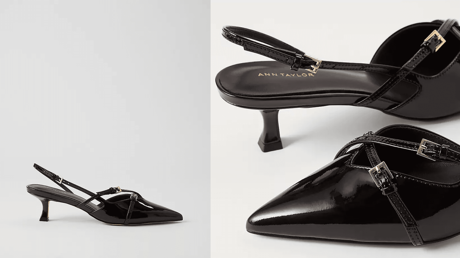 A basic black pair of kitten heels are a closet staple, so they’re worth the investment. You can wear them countless ways at all kinds of occasions, from weddings to networking events. This pair from Ann Taylor is made of a glossy, patent leather. The gold buckles and extra straps make them feel not-so-grandma-like, which we love. ($168, Ann Taylor)