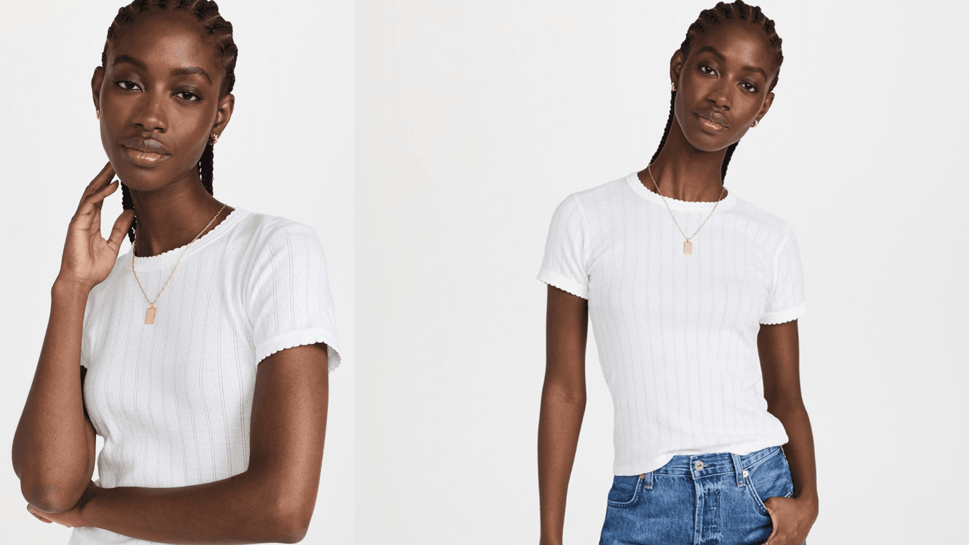 Finding the right T-shirts and tank tops that are office appropriate can be weirdly hard. Our tip is to opt for thicker fabrics. We love pointelles because their lacier design makes a T-shirt look more like a fancier top or sweater. ($78, Shopbop)
