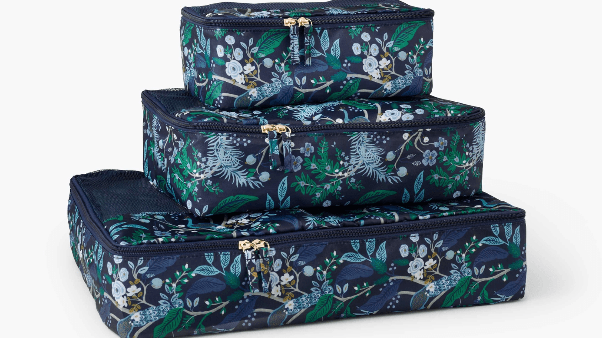 Organized suitcases for the win. One editor’s mom claimed that this set is the best thing that’s ever happened to her (besides her kids, of course). It comes with three zippered mesh packing cubes of varying sizes and a mesh laundry bag. This set is ultra-spacious and covered in Rifle Paper Co.’s classic peacock botanical print. The best part? The handles that make them easy to grab. ($54, Rifle Paper Co.)